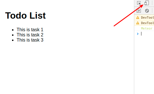 At this point meteor should be running on port 3000 so you can visit the running app and see your list with three tasks displayed at http://localhost:3000/ - but if meteor is not running, go to your terminal and move to the top directory of your project and type meteor then press return to launch the app.
