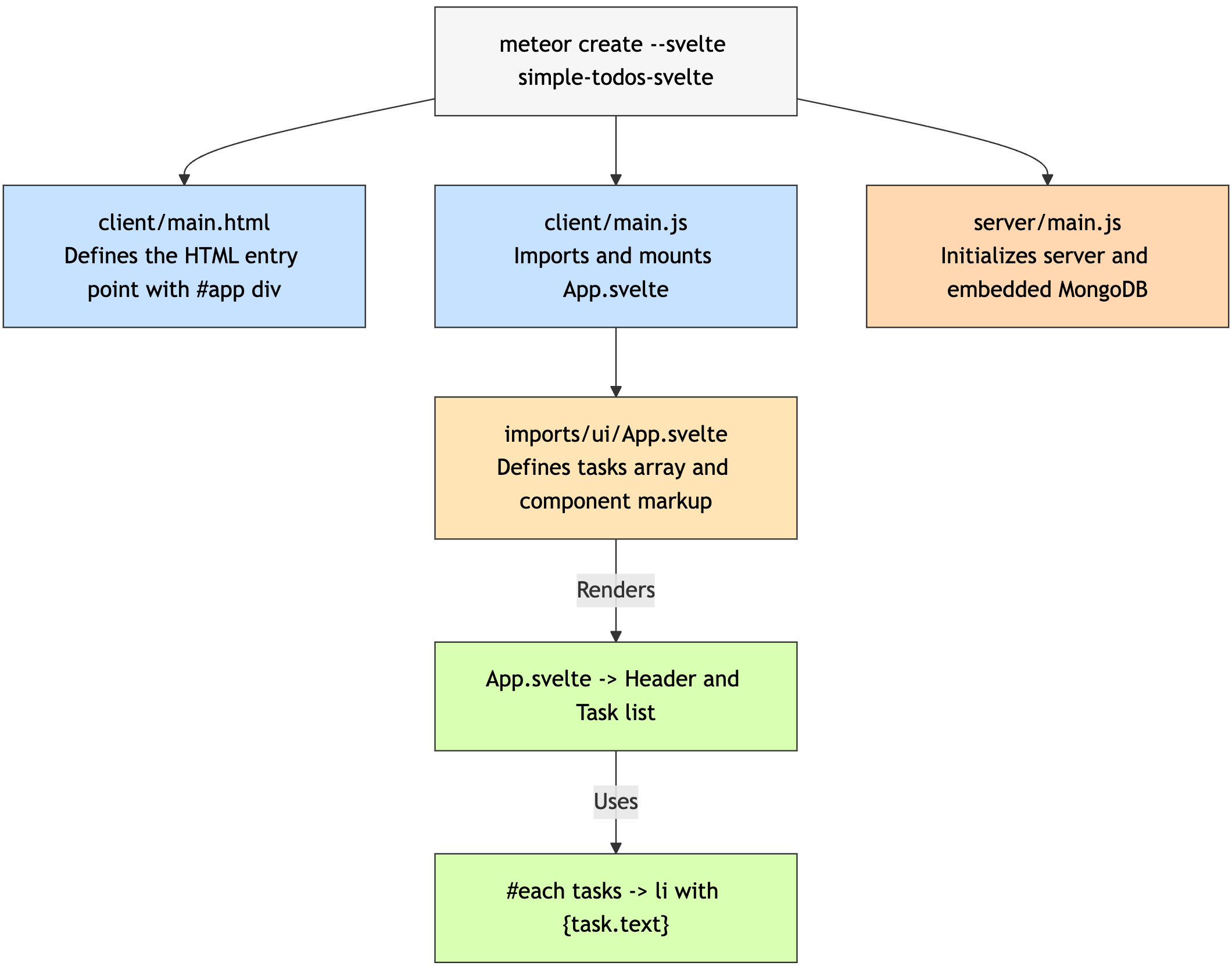 Meteor will create all the necessary files for you. With --svelte option, Meteor generates a project using Svelte 5 and Rspack as the bundler, and this is the approach walked through in this tutorial. Using the Rspack bundler is the default convention in Meteor 3.4+, as it improves dev speed, enables more build features, and provides better control over bundle size and configuration.